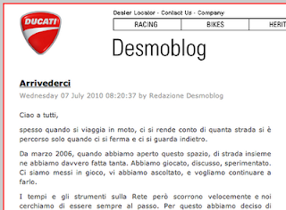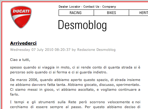 A mio parere, il più interessante ed istruttivo tra i casi citati è quello del Desmoblog che, da qualche mese, è stato chiuso con la seguente giustificazione da parte di Ducati: “[…]I tempi e gli strumenti sulla Rete però scorrono velocemente e noi cerchiamo di essere sempre al passo. Per questo abbiamo deciso di chiudere il Desmoblog: per concentrare tutti i nostri sforzi su altri spazi di conversazione“. Ovvero Facebook, Twitter e YouTube.